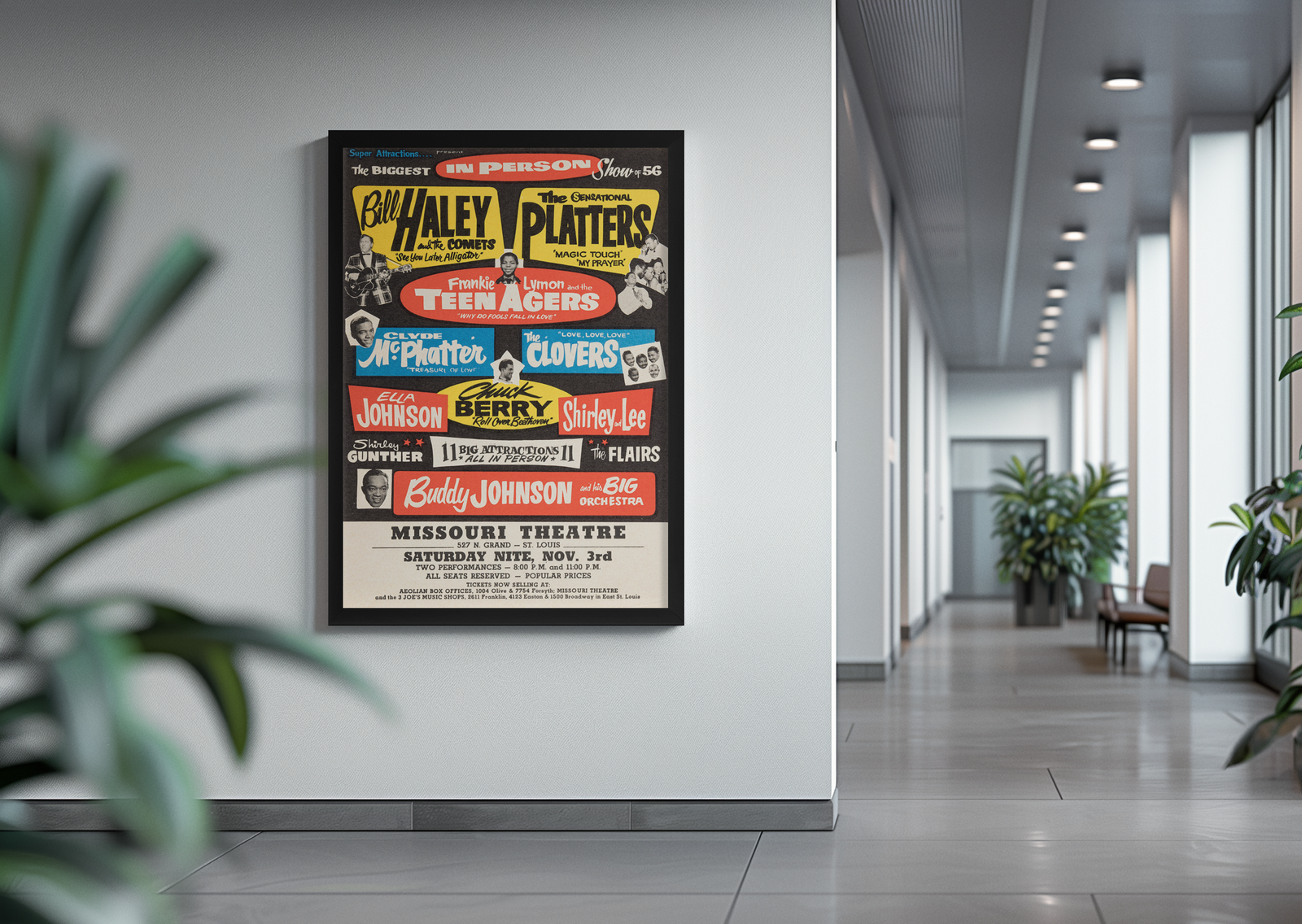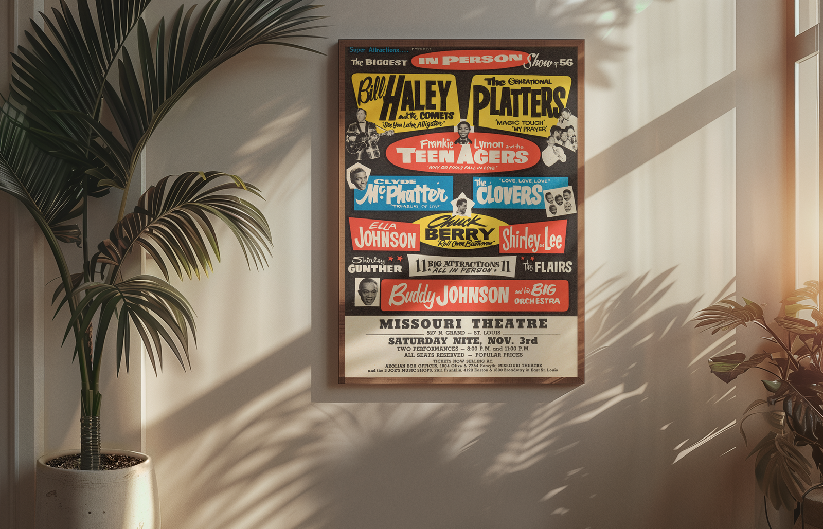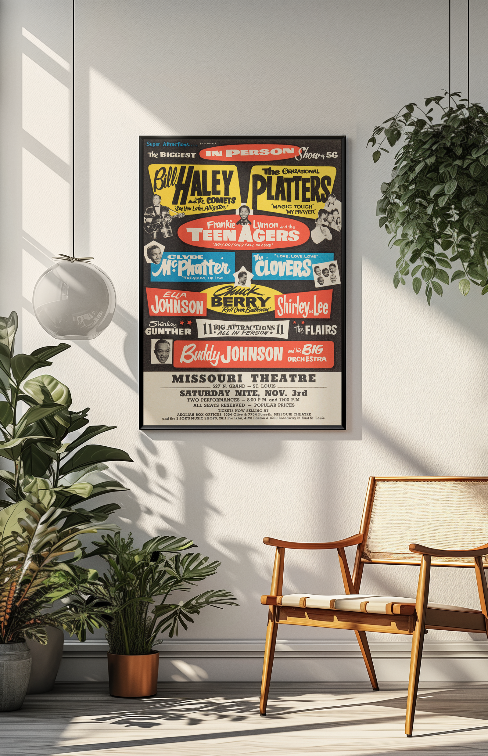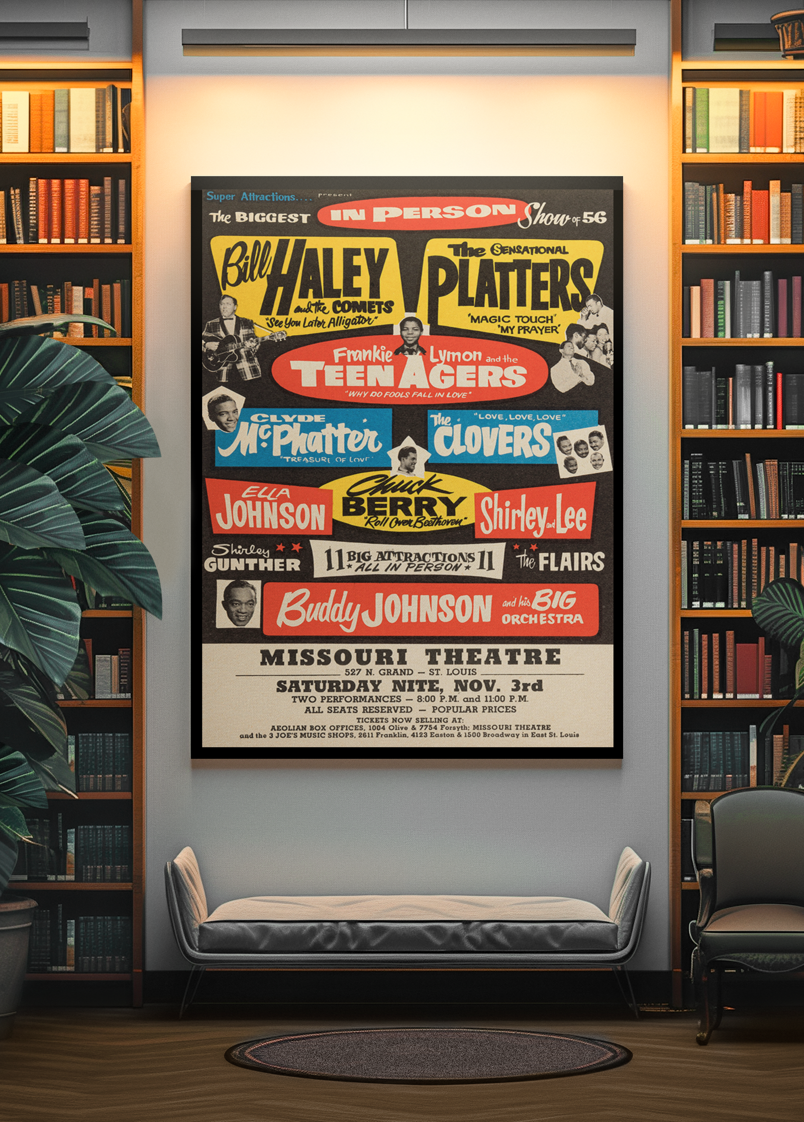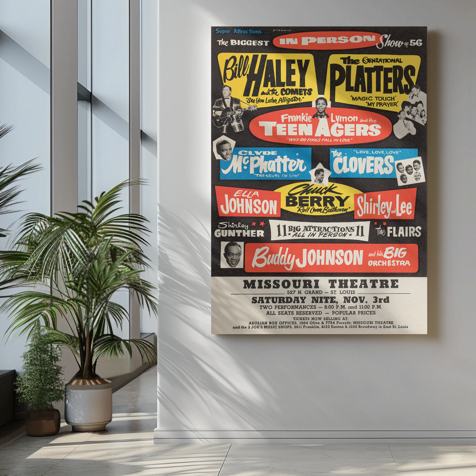 This original-style 1956 concert print honors the icons who helped shape rock and roll. Featuring Chuck Berry and Bill Haley, this classic wall art brings energy, rhythm, and retro flair to any space.