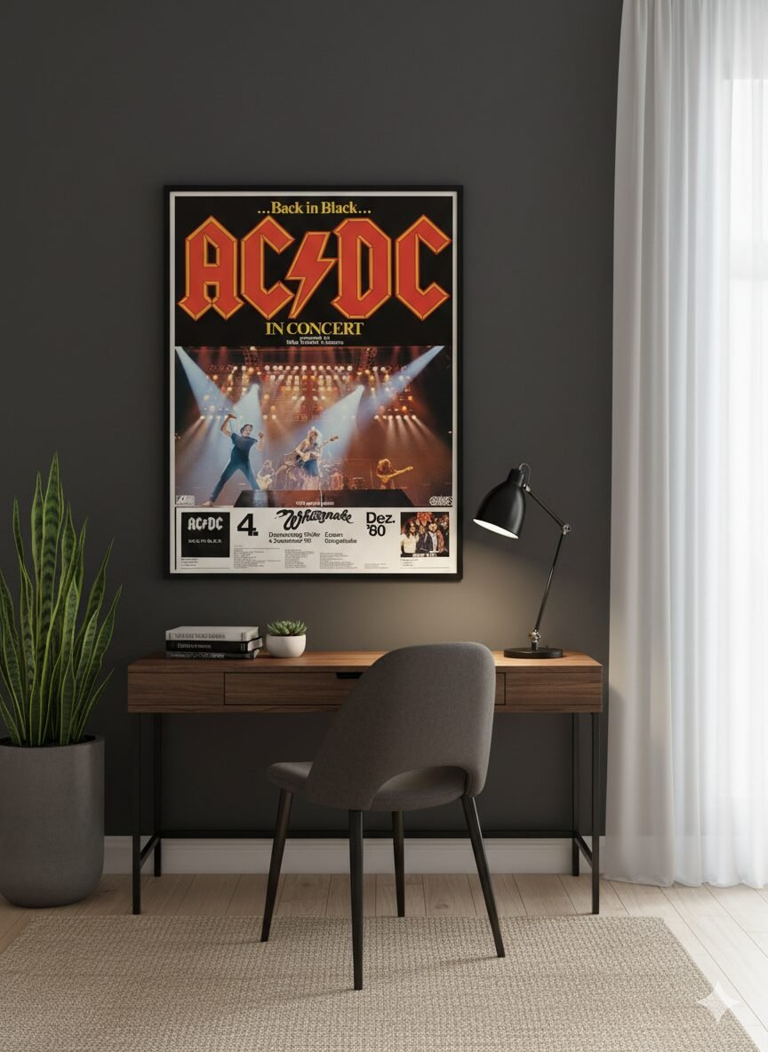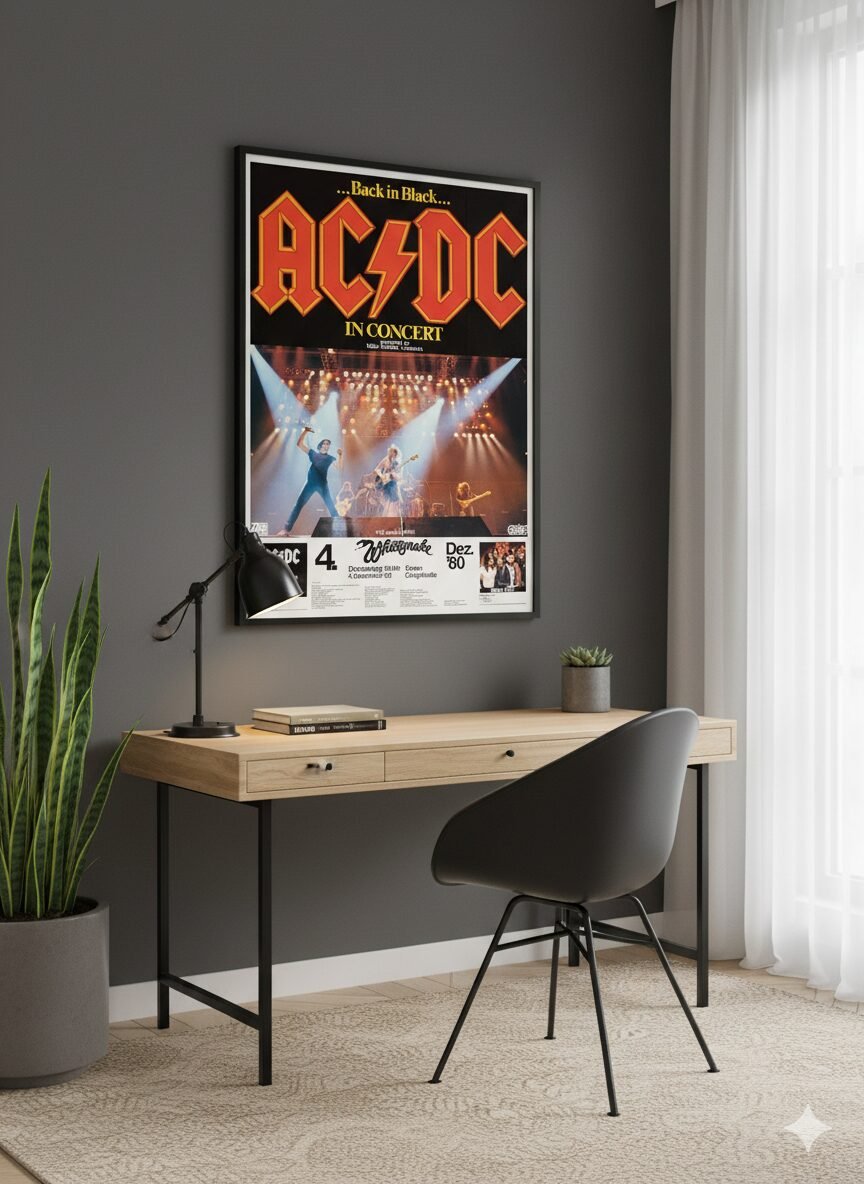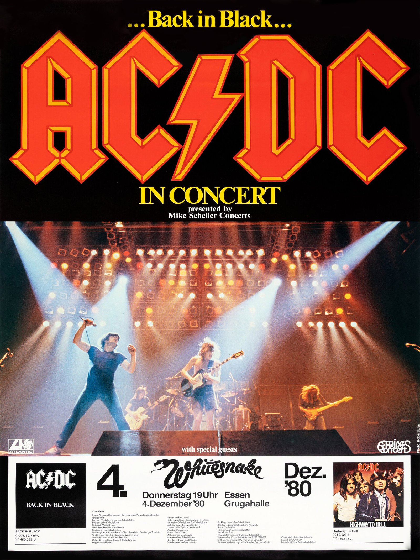 Featuring Angus Young, Malcolm Young, and Bon Scott of AC/DC with David Coverdale of Whitesnake, this original 1980 Essen concert poster captures the explosive energy of two legendary rock bands at their peak. A rare and highly collectible piece of hard rock history.
