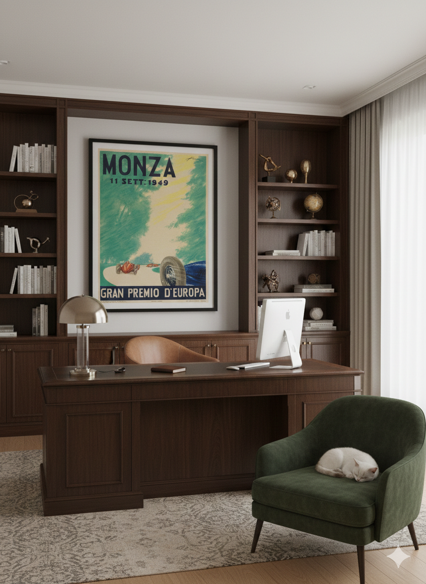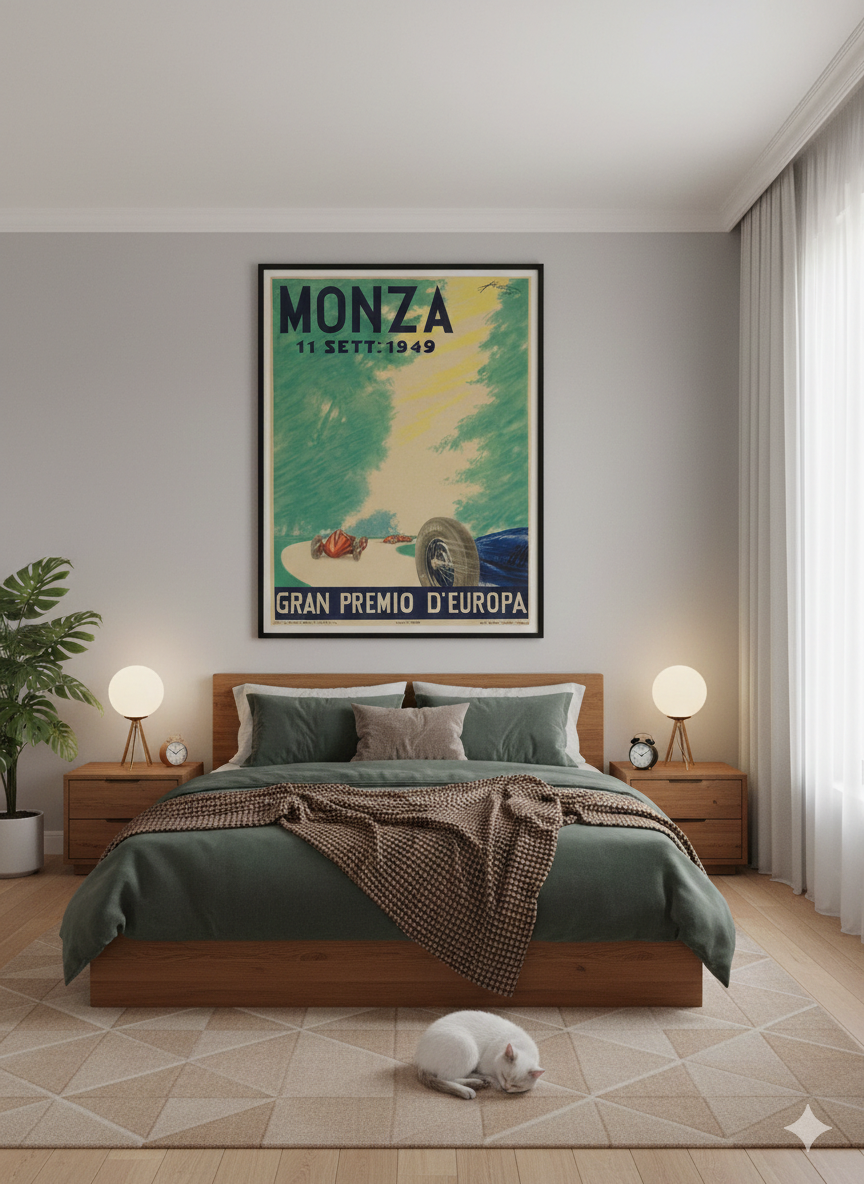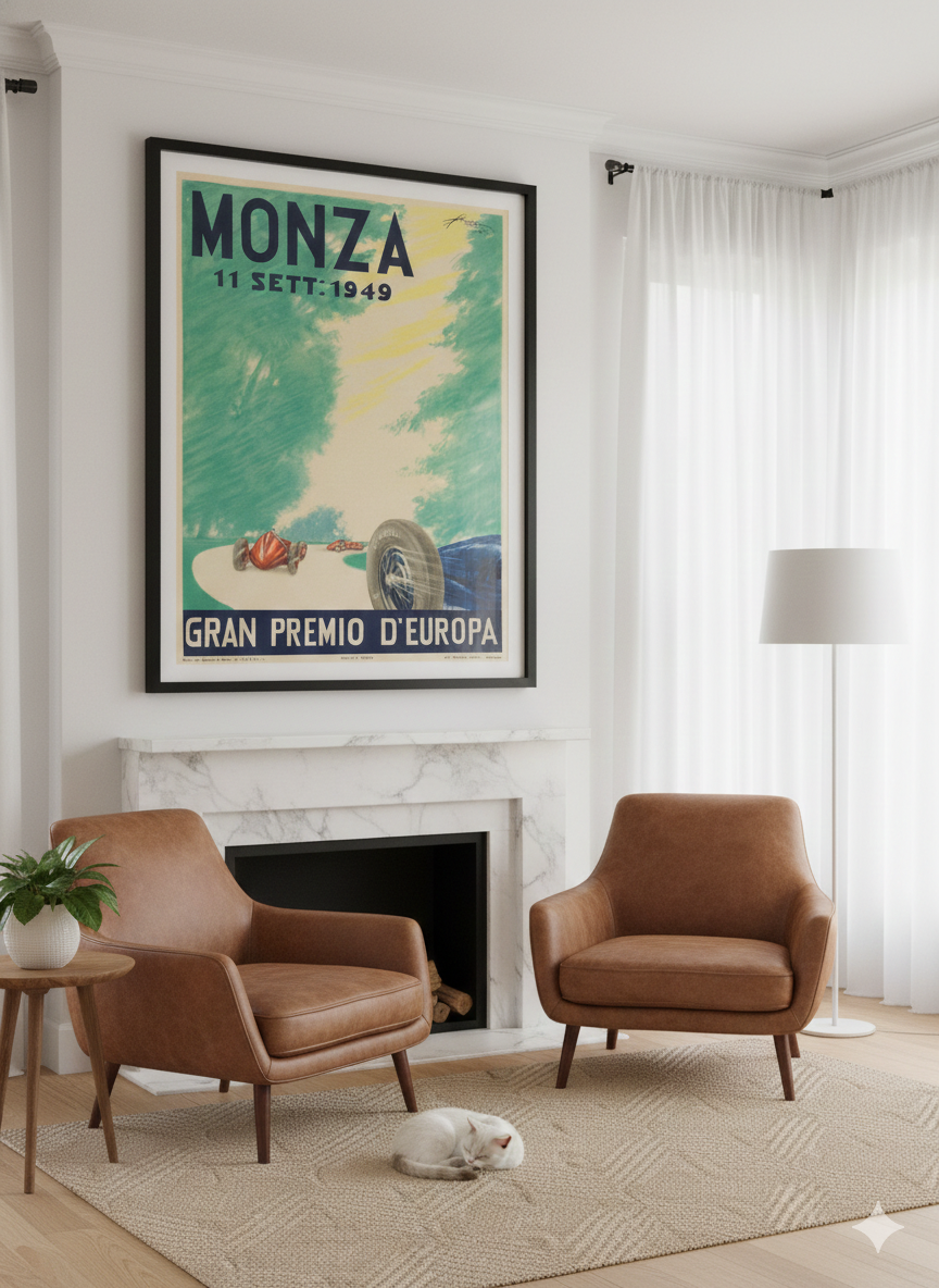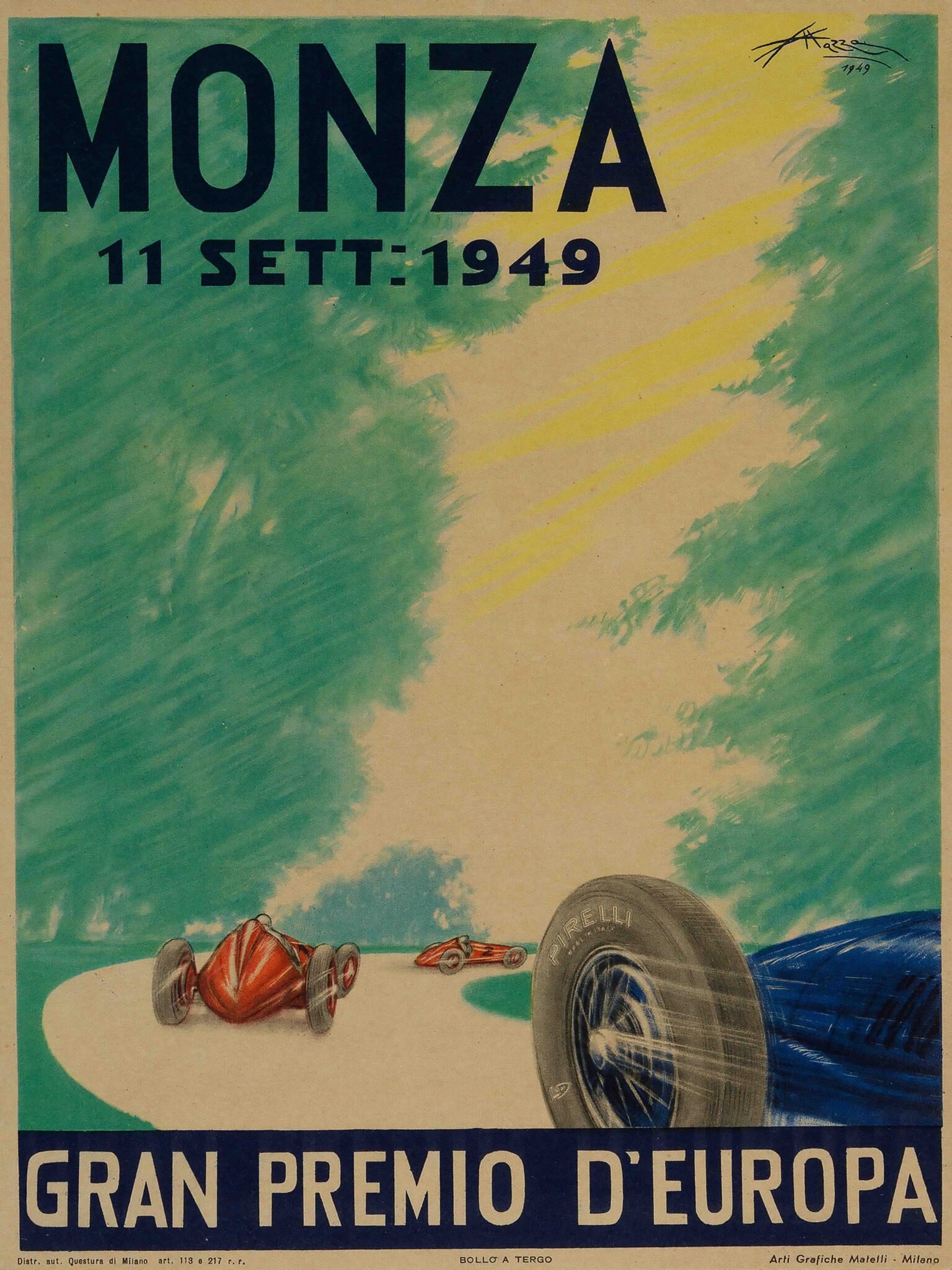 1949 Italian Grand Prix In Monza – Classic 1949 motor racing poster celebrating the Italian Grand Prix, held at the legendary Autodromo Nazionale Monza, one of Europe’s most historic circuits.