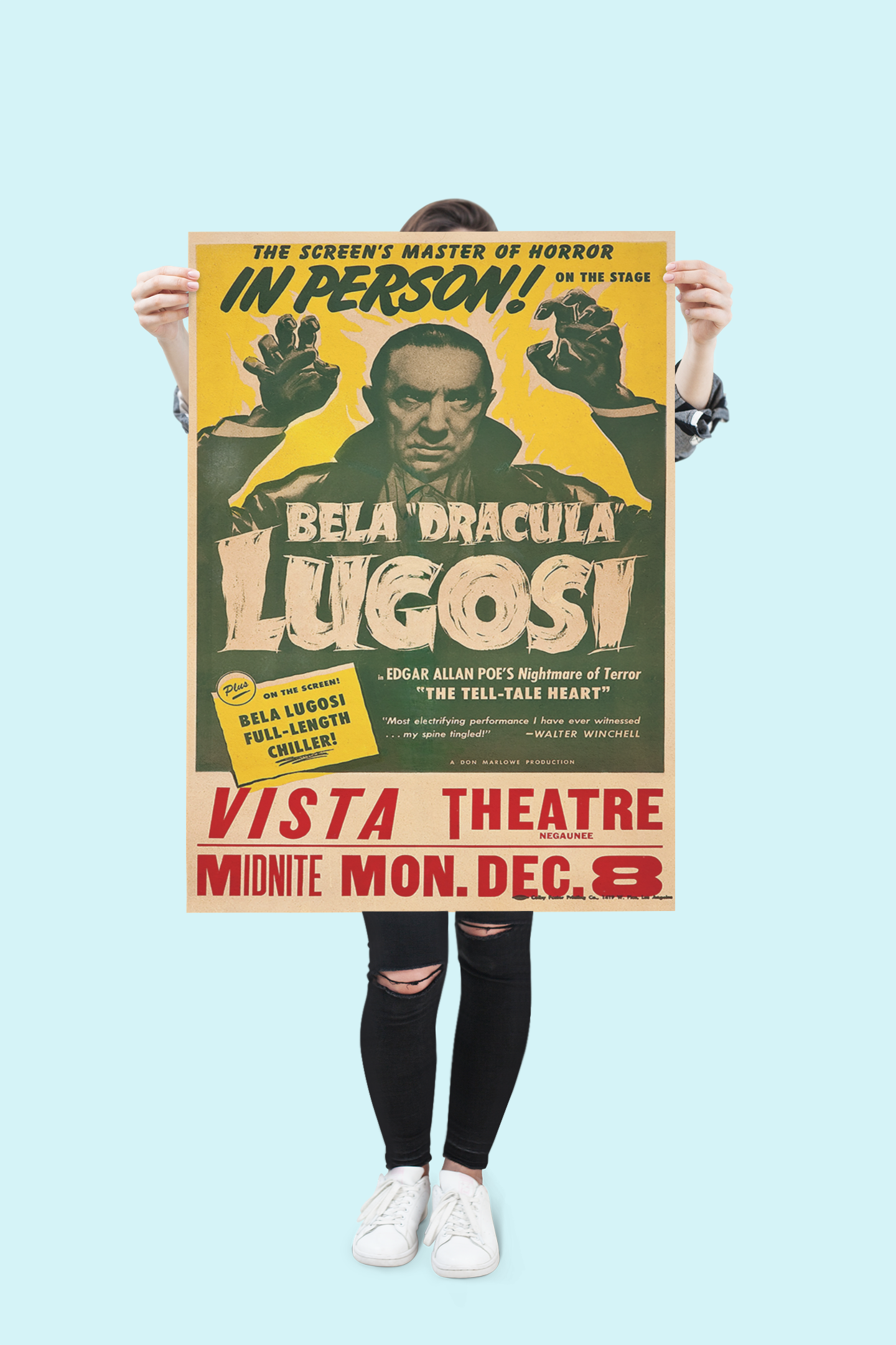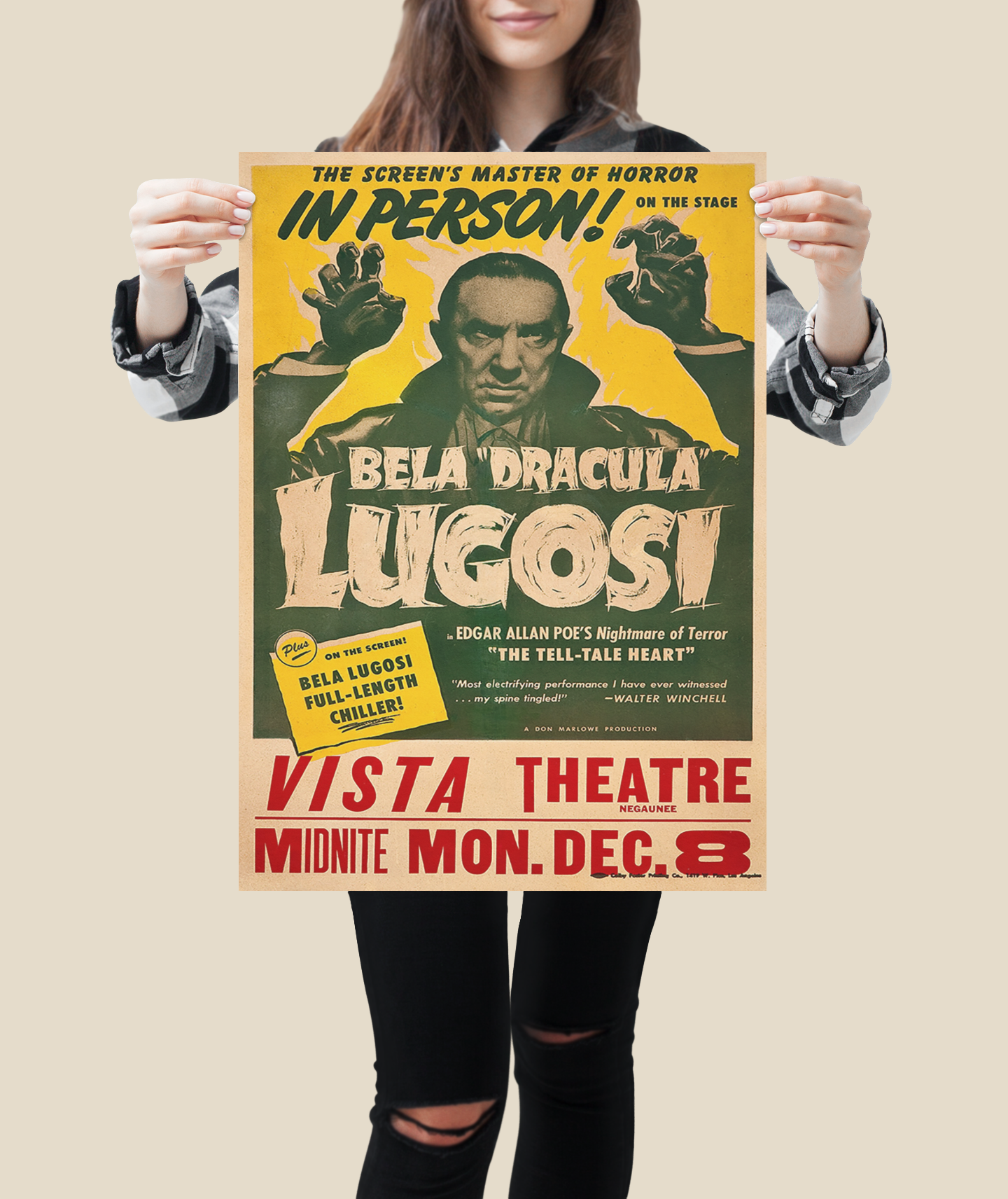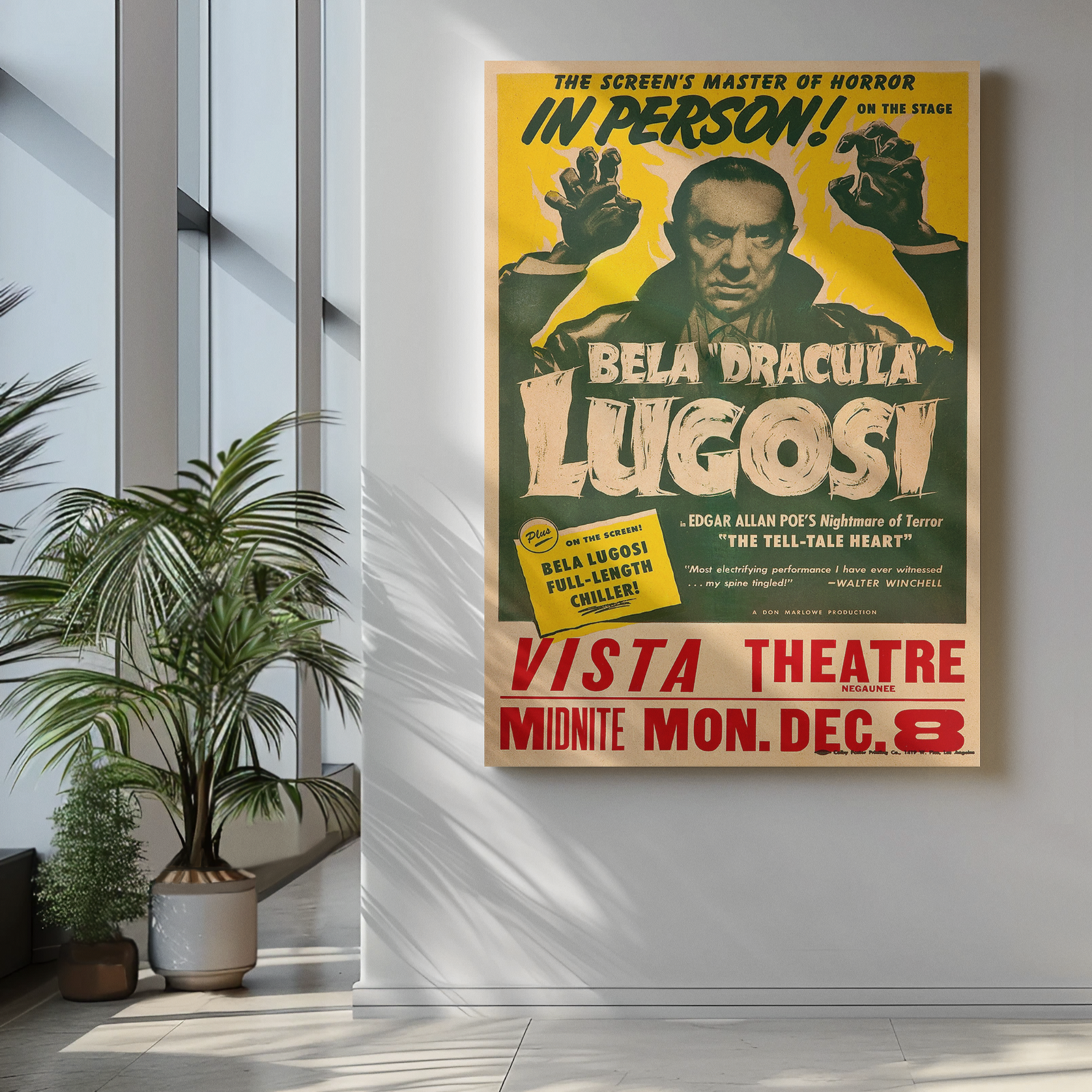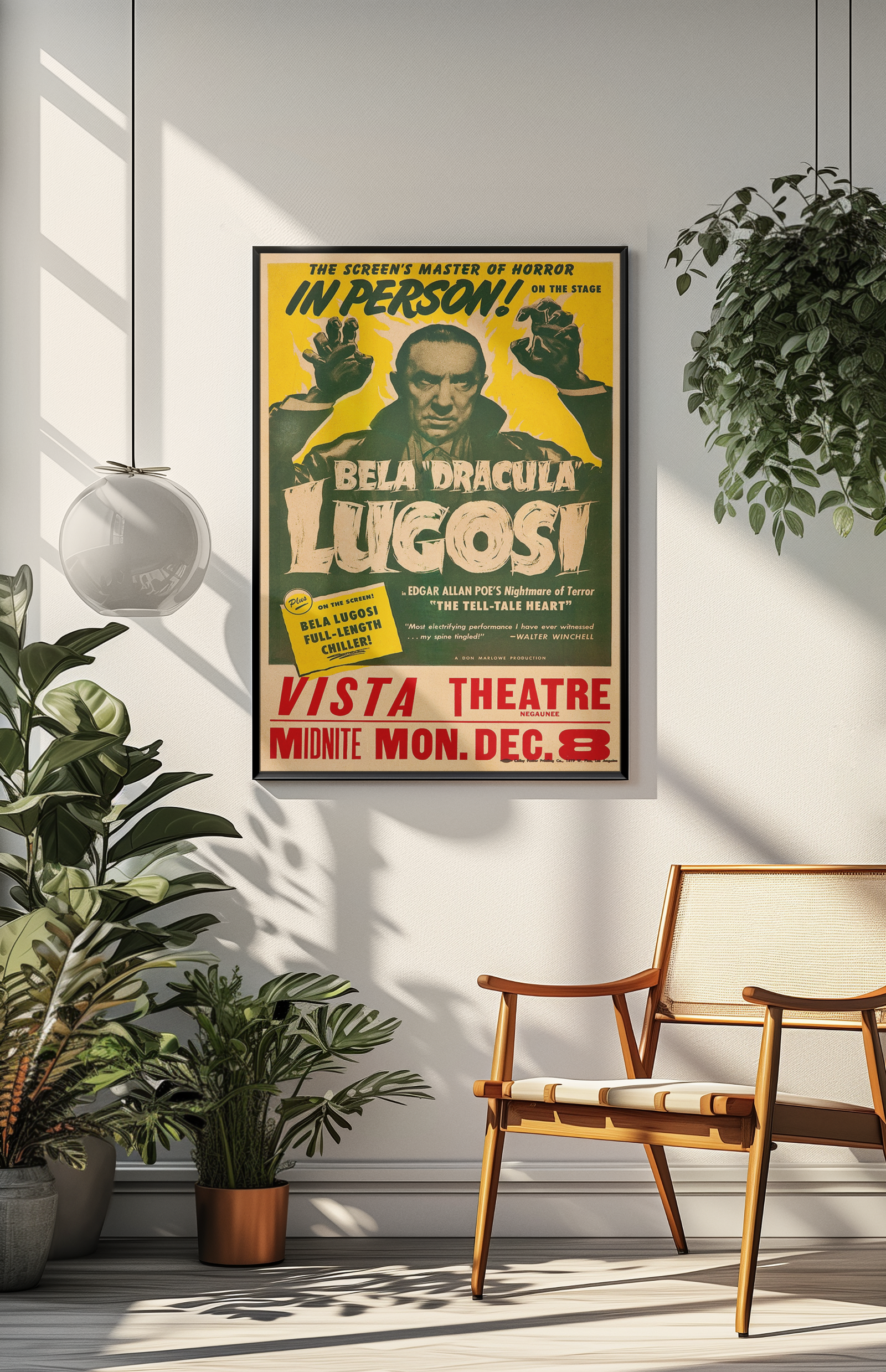 Bring iconic gothic horror to your space with this vintage 1940s poster featuring Bela Lugosi in Edgar Allan Poe’s The Tell-Tale Heart. A haunting piece of theatrical history, this print is ideal for horror collectors and classic movie fans alike.